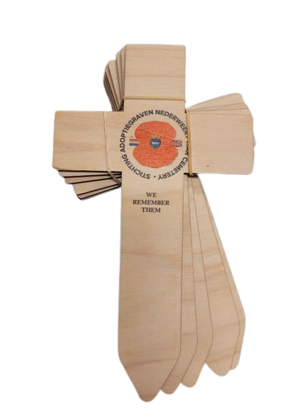 Wooden cross with inscription, these are made of wood and are also for sale at Botanica Bloemen and home decorations, Kapelaniestraat 1 in Nederweert (opposite the Church). These crosses can be ordered by sending an email with the quantity and your address details.