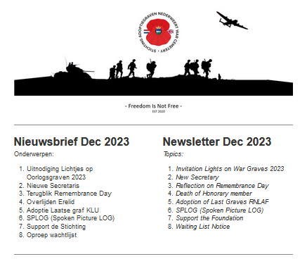 De Stichting brengt regelmatig nieuws over ceremonies en onderzoeksresultaten uit via een digitale nieuwsbrief. Adoptanten en Vrienden van de Stichting ontvangen die in hun mail. U kunt zich, geheel vrijblijvend, ook als Vriend aanmelden. Deel gerust deze mogelijkheid met familie, vrienden en kennissen want uw interesse wordt zeer op prijs gesteld. Voor aanmelden klik hier.